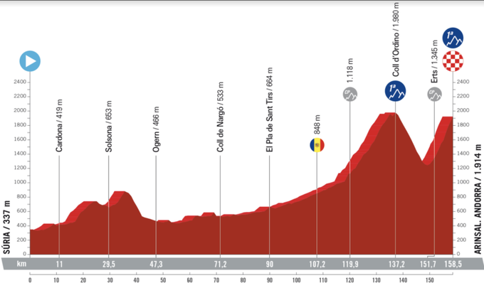 Reaching the summit of Arinsal, located at an altitude of 1,914 meters, will offer spectacular views of several of Andorra's numerous mountain passes and nearby towns. The fact that this stage is so early in the competition is likely to cause some riders to suffer and be out of position. Only about 70 riders are expected to remain in the lead at the end of the stage, after climbing the less difficult Coll d'Ordino.