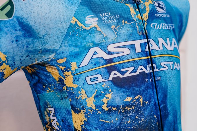 Designed by Giordana, the jersey features similar colours but a completely different look. "The unique charm of the pattern, similar to the veins of mineral stones, comes from the color affinity with the blue of the sky and the gold of the sun, as well as with elements of the flag of Kazakhstan," the team describes it.