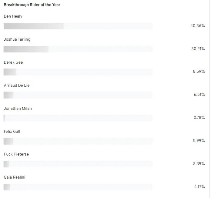 Derek Gee following his standout Giro d'Italia, although there is a marked drop off in votes to the Canadian, who was voted for by 8.59% of the fans.