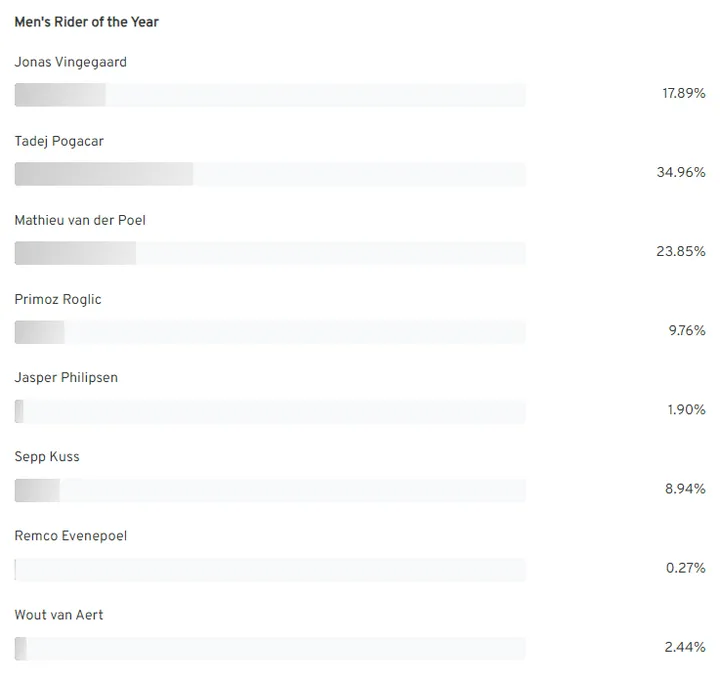 Looking down the list, Primoz Roglic just about collected a bigger haul of votes than his former Jumbo-Visma teammate and fellow Grand Tour winner in 2023, Sepp Kuss, whilst Wout van Aert, Jasper Philipsen and Remco Evenepoel were forced to settle for 17 votes between them.