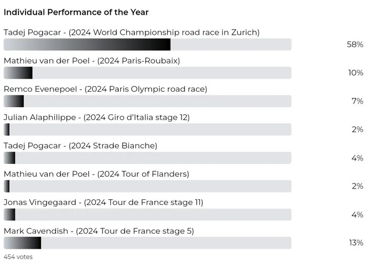 In total, 58% of the votes landed on the side of Pogacar, a considerable margin clear of Cavendish (13%) and Van der Poel (10%), with the likes of Remco Evenepoel's Olympic victory taking 7%, Jonas Vingegaard's Tour de France stage win finishing at 4%, Pogacar's Strade Bianche at 4% and Van der Poel's Tour of Flanders victory down at just 2%.