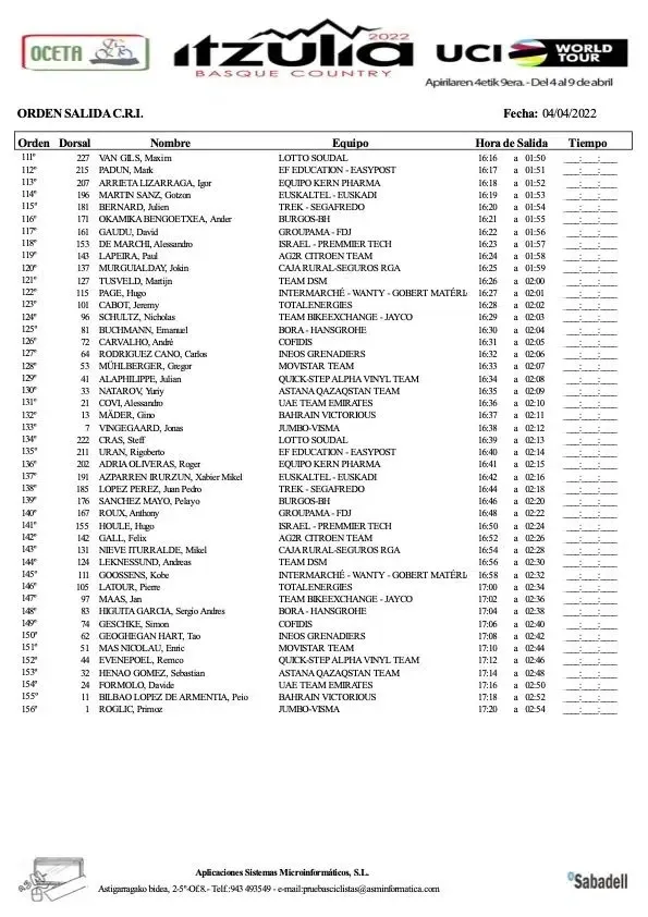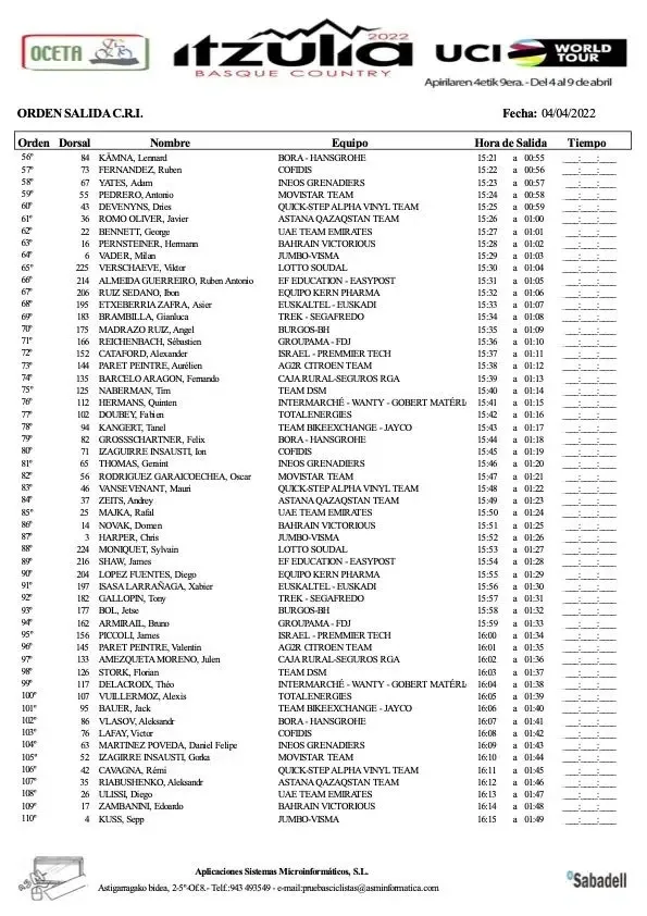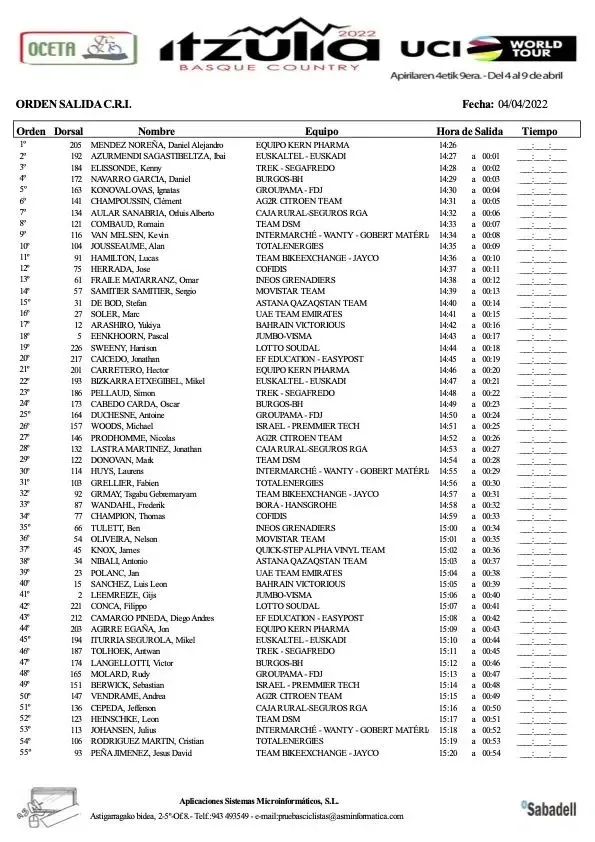 Equipo Kern Pharma's Daniel Mendez will be the first on the starting ramp tomorrow at 14:26 local time, and the final rider to start his effort will be defending champion and pre-race favourite Primoz Roglic.