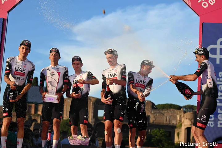 UAE Team Emirates - XRG who takes the title of best team's classification after having spent two weeks with Juan Ayuso and Isaac del Toro in the fight for the race's victory. Even after his departure, the work of riders such as Adam Yates, Brandon McNulty and Rafal Majka meant the team managed to win with a very comfortable margin over Bahrain - Victorious and Team Visma | Lease a Bike.
