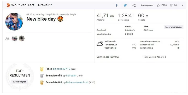 In a ride posted this morning van Aert shared a picture of himself on a gravel bike, with the Strava activity's caption being 'New bike day'. The