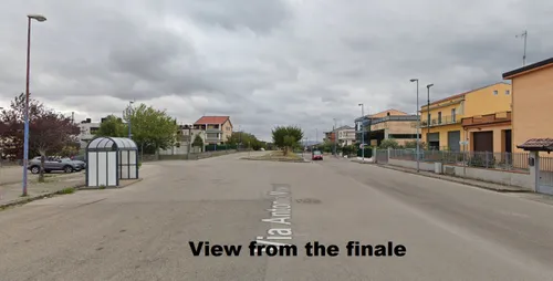 Eventually the riders pass by the center of Melfi but the finale is outside of the center. They head into an explosive finish, the roads are rolling and the finishing straight sees a 4% gradient that is far from a pure sprint. Several roundabouts and corners, with 1.1 kilometers to go, 750 and 300 meters to go. The final corner is quite sharp, positioning is crucial and from that corner onwards it's a full-on sprint.