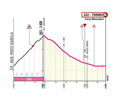 A downhill finale will follow, very quickly the riders reach Torino and only the final meters will be flat. Gaps over the top, an attack in the climb, can be decisive to attribute the first stage win.