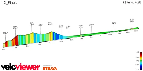 This could well happen. The final ascent is the hardest, but not overly difficult. The hilltop to Monte Giove is 1.2 kilometers long at 9.2% and summits with only 13Km to go. It's gradients go up to 18%, it can create differences in any group and decide the outcome of the stage. Following a small plateau the riders quickly descent into the final flat 6 kilometers, where teams can still work for a sprint to come to be.