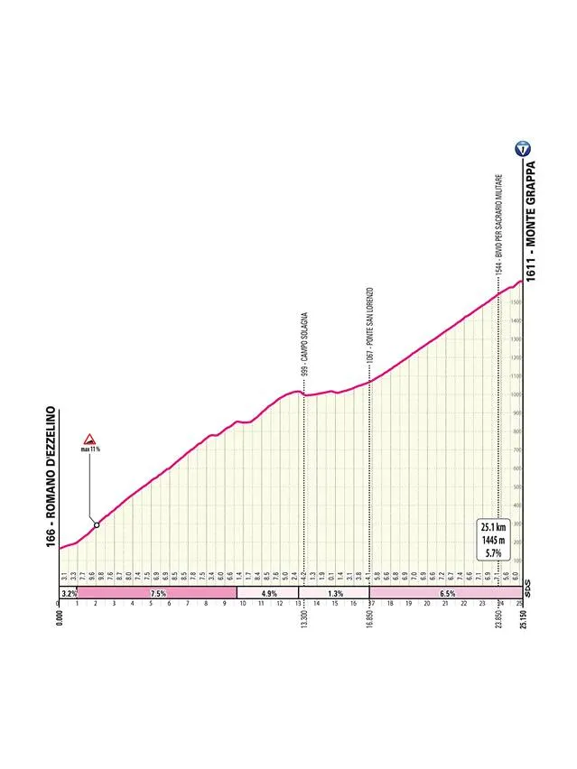 Later on however, the climbs become very long. Not through it's most difficult side, but the riders will take on Monte Grappa, 25 kilometers long at 5.7%, a climb that will take around an hour and honestly it features gradients that are hard enough to launch serious attacks. It's the final day of the second week, will someone try? Possibly, but unlikely, as the climb still ends with 91 kilometers to go.