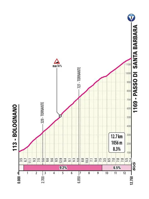12.9Km at 4.9% (130Km to go), 10.1Km at 7.5% (88Km to go) and then two climbs that are a brutality, and both can see serious GC differences depending on where the race blows up. The first of which is Santa Barbara which is 12.7 kilometers at 8.3%, a constantly steep climb that is very long. It ends with only 34 kilometers to go and the descent is steep and very technical which can also see differences.