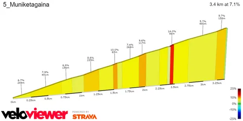 The stage will be decided in it's final section which features a two-lap circuit that features a climb. This is the ascent to Muniketagaina just outside Amorebieta. The climb is 3.4 kilometers at 7% with 11 switchbacks in it. You could barely find a more explosive ascent, attacks are certain and with only 13 kilometers to the finish there are certainly reasons for it.