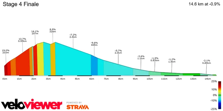 Like the previous day, this is one where if you go over the top of the final climb alone a victory is quite likely, as most of the way to the finish is downhill and will be very fast - whilst a group will never have an easy time organizing a proper chase. However of course, riders will have to pay attention to the roundabouts and take the right side always!