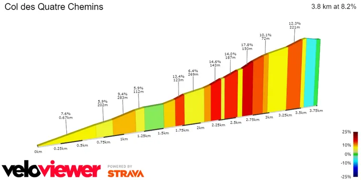 This is the Col des Quatre Chemins - part of the Col d'Éze. It is 3.6 kilometers at 8.8%, but the final half is quite steeper. The ramps go up to 18%, brutal and enough to create differences. The race can end atop this ascent, it summits with 9 kilometers to go and from there on it's almost downhill all the way to the finish line at the Promenade des Anglais.