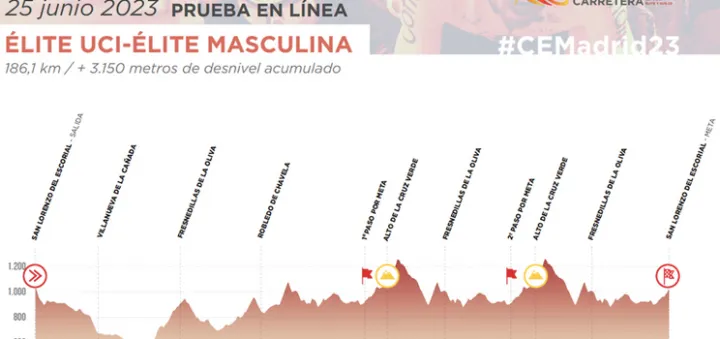 The Elite UCI-Elite men's peloton of this Spanish Championships will ride on the same roads and, in fact, will complete the same route as the U23s with the difference that the initial loop will have about 20 kilometers more. After the start, the Elite will pass through Valdemorillo and head to Villanueva de la Cañada and Quijorna before reaching Navalagamella. This variation will be the only difference with the U23 route, since after completing this initial loop of almost 80 km that will take them back to the finish line, they will face two laps of the circular route that includes the ascent to the Alto de la Cruz Verde, where a beautiful fight for the right to wear the Spanish champion's jersey will surely be unleashed. In total, there will be 186.1 km with 3,150 meters of elevation gain to close this 2023 edition of the national race, which promises to be exciting.