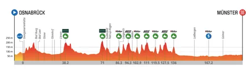 After completing the last lap in Lengerich, the riders will tackle the final 60 kilometers to the finish line. With just 14.1 kilometers to go, the peloton will head to the local circuit in Münster, which consists of four laps of 4.3 kilometers each. This final section features a short cobbled section at the beginning of the lap, followed by two right-angled left turns in the last 1.5 kilometers. The final straight, officially 350 meters, will include a right turn before reaching the Schlossplatz, where the winner of this exciting race will be decided.