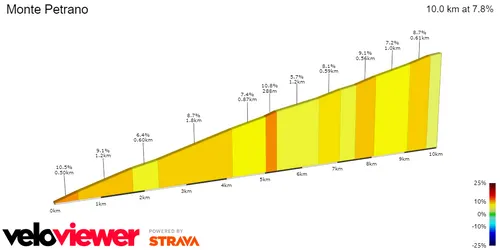 10 kilometers at 7.8%, with a very difficult start at 9/10%. The gradients do lower slightly into it's final phase but there, the riders find a few hairpins which allow for explosive moves and motivate attacks. A climb that is not overly difficult, but is tough enough for the pure climbers to make the difference. The overall classification may be decided here.