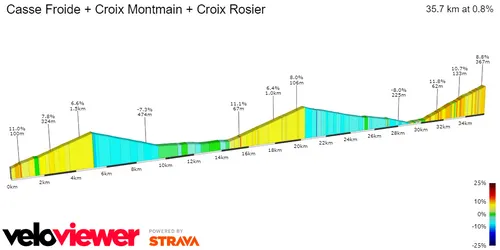 The first of the climbs is the Col de la Casse Froide which is 5.2 kilometers at 6% and summits with 59 kilometers to go. Then follows the Col de la Croix Montmain which is 5.5 kilometers at 6.2% which ends with 44 kilometers to go, and then finally the Col de la Croix Rosier which is the toughest of the three, 5.4 kilometers at 7.7% which ends with 28.5 kilometers to go.