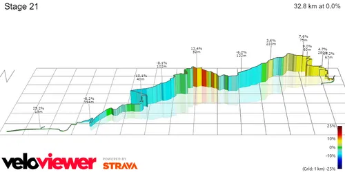 After a little bit of rolling roads there is the small Col d'Èze which is 1.6 kilometers at 8.88, those looking to fight for time will go all-out to the limit here as a long descent follows. In time-trial bikes this descent can be dangerous however, it is technical and also quite steep at points. Only the final 5 kilometers then are flat, going back and fourth in the beachside of Nice before reaching the finale of the Tour.