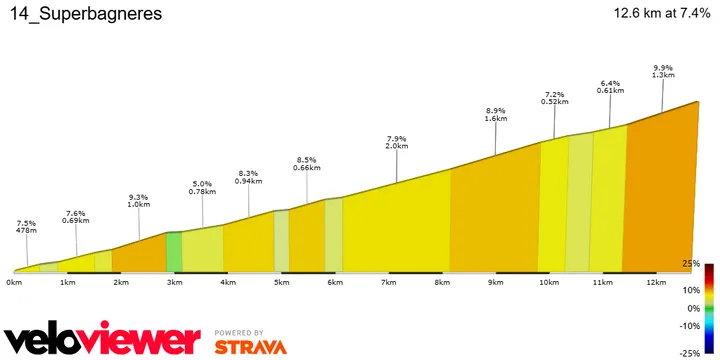 The climb is 12.6 kilometers at 7.4%, quite constant and difficult. With 1800 meters of altitude and quite a lot of switchbacks, it's a climb with several challenges. The gradients are never truly brutal but the hardest kilometer is the last, and so we could see some meaningful differences emerge even if the attacks only come late in the day.