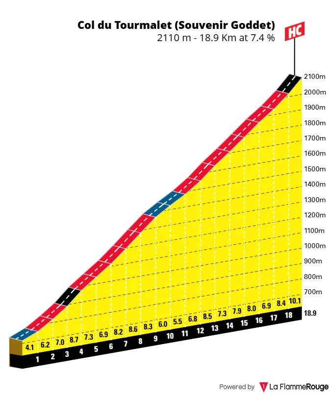 As is the case virtually every year, the riders will be going up the Col du Tourmalet, which will be 19 kilometers at 7.4%. 93 kilometers to go however, this will be a warm-up for what's to come later. But most likely all three climbs before the final one will be serving for fatigue and will not be attacked hard.