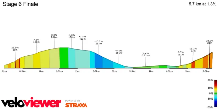 A very quick descent and flat section lead into the final 700 meters ramp up at 10% towards the finish line, which may see a mix of climbers, classics riders and sprinters fight for the win.