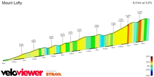 Two 3-kilometer climbs provide space for attacks early in the day. A rolling day in the hills, it's not too difficult to image a big breakaway trying to establish itself and threatening the overall classification. A three-lap circuit around Mount Lofty will take place. In total, it's around 14 kilometers of false-flat climbing with a couple of small downhill sections. However as we've been able to observe last year, everything is in preparation for the final 1.6 kilometers.
