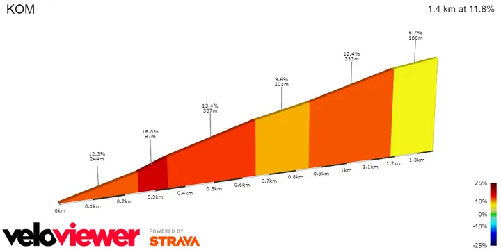 However the ascent is 1.4 kilometers long at 11.5%, this is hard enough to make differences, create splits. The climb ends with 19.5 kilometers to go. There is space to reorganize afterwards, however it is an open day.