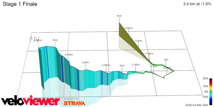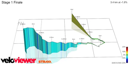 With 20 kilometers summits a small climb that is 8 kilometers long at 4%. It is not a day for the sprinters as not only does this climb put some damage in the peloton, but the following descent and run-up to the finish is very fast, punchy and technical. Another small hilltop ends with 7.8 kilometers to go, and then most of the way into town is a very fast and twisty descent.