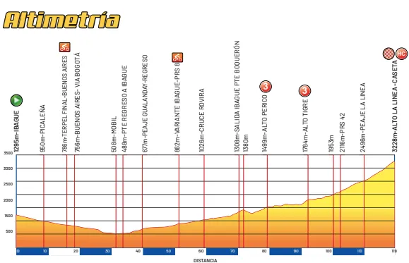 The fourth stage will be short but intense, with 119.3 kilometers of steep terrain from the start in Ibagué to the out-of-category pass of Alto de la Línea Caseta. This challenging climb will test the endurance of the cyclists and could be decisive for the development of the race.