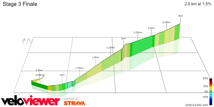 There will still be over 100 kilometers to go but the riders will tackle a 17-kilometer long ascent which will put some fatigue in the legs of the riders. With 43 kilometers to go comes the end of the last true climb of the day which is 6.3 kilometers at 3.3%. There is, again, 2600 meters of climbing on the day and a little bit of it still comes in the final kilometers.