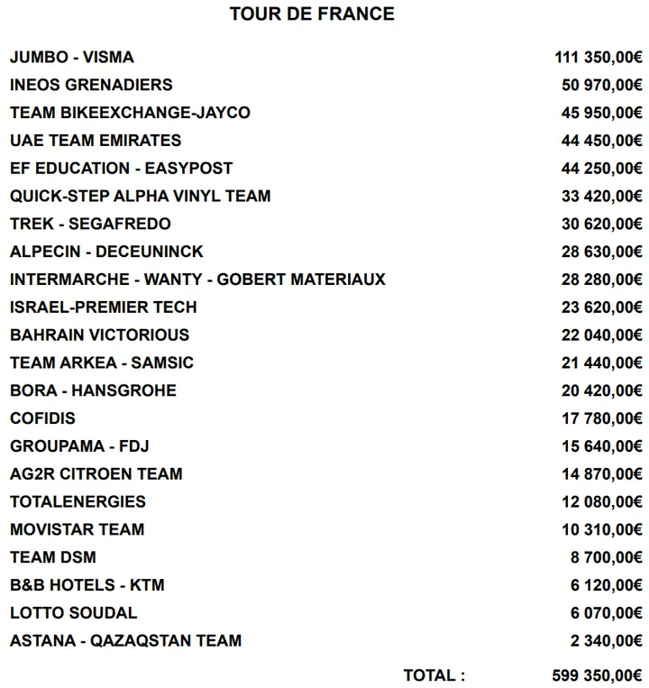 Tour de France has been shared by the race organizers, with almost €600.000 already set to be handed out to the teams as a result of their impact in the ongoing race.