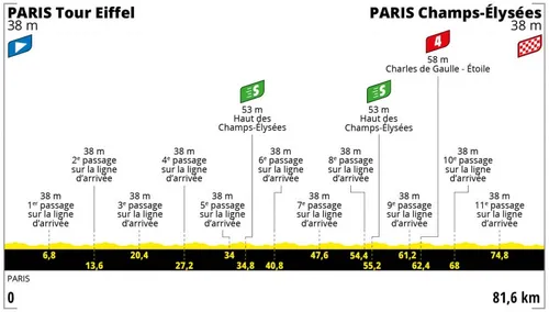 The first stage of the Tour de France Femmes has 11 laps of 6.8 kilometers on the Champs-Élysées in Paris. The route is flat and not spectacular, and as always we expect a sprint.