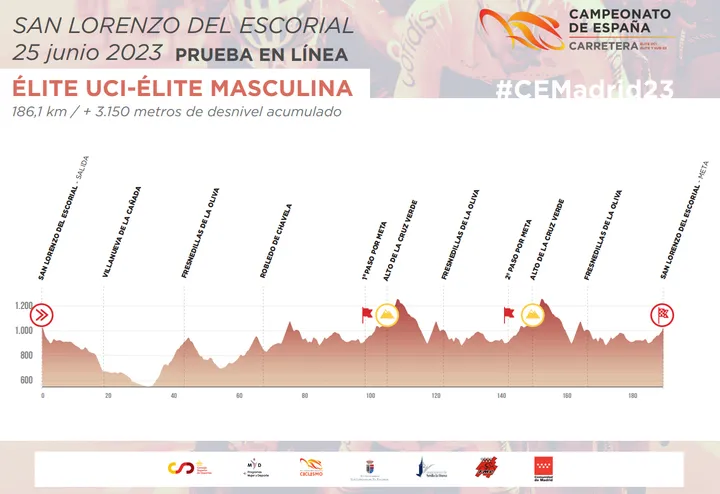 The Elite UCI-Elite men's peloton of this Spanish Championships will ride on the same roads and, in fact, will complete the same route as the U23 riders, with the difference that the initial loop will be 20 kilometers longer. After taking the start, the Elite-Sub23 will pass through Valdemorillo and head to Villanueva de la Cañada and Quijorna before reaching Navalagamella. This variation will be the only difference with the U23 route, since after completing this initial loop of almost 80 km that will take them back to the finish line, they will face two laps of the circular route that includes the ascent to the Alto de la Cruz Verde, where a beautiful fight for the right to wear the Spanish champion's jersey will surely be unleashed. In total, there will be 186.1 km with 3,150 meters of elevation gain to close this 2023 edition of the national race, which promises to be exciting.