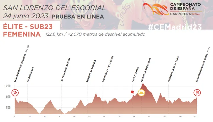 In total, the Elite-U23 girls will complete 122.6 km with just over 2,000 meters of elevation gain distributed along a route with a leg-breaking profile. After leaving San Lorenzo del Escorial they will face a first loop that will take them through Valdemorillo, Navalagamella, Fresnedillas de la Oliva, Colmenar del Arroyo, Robledo de Chavela, Zarzalejo and Peralejo before going back under the finish arch and starting a new circular route that will lead them to the Alto de la Cruz Verde, which will be the climb that will decide the race. After the main climb of the race, they will face a return section that will take them through Robledo de Chavela, Fresnedillas de la Oliva and Zarzalejo before finally reaching the finish line in San Lorenzo del Escorial.