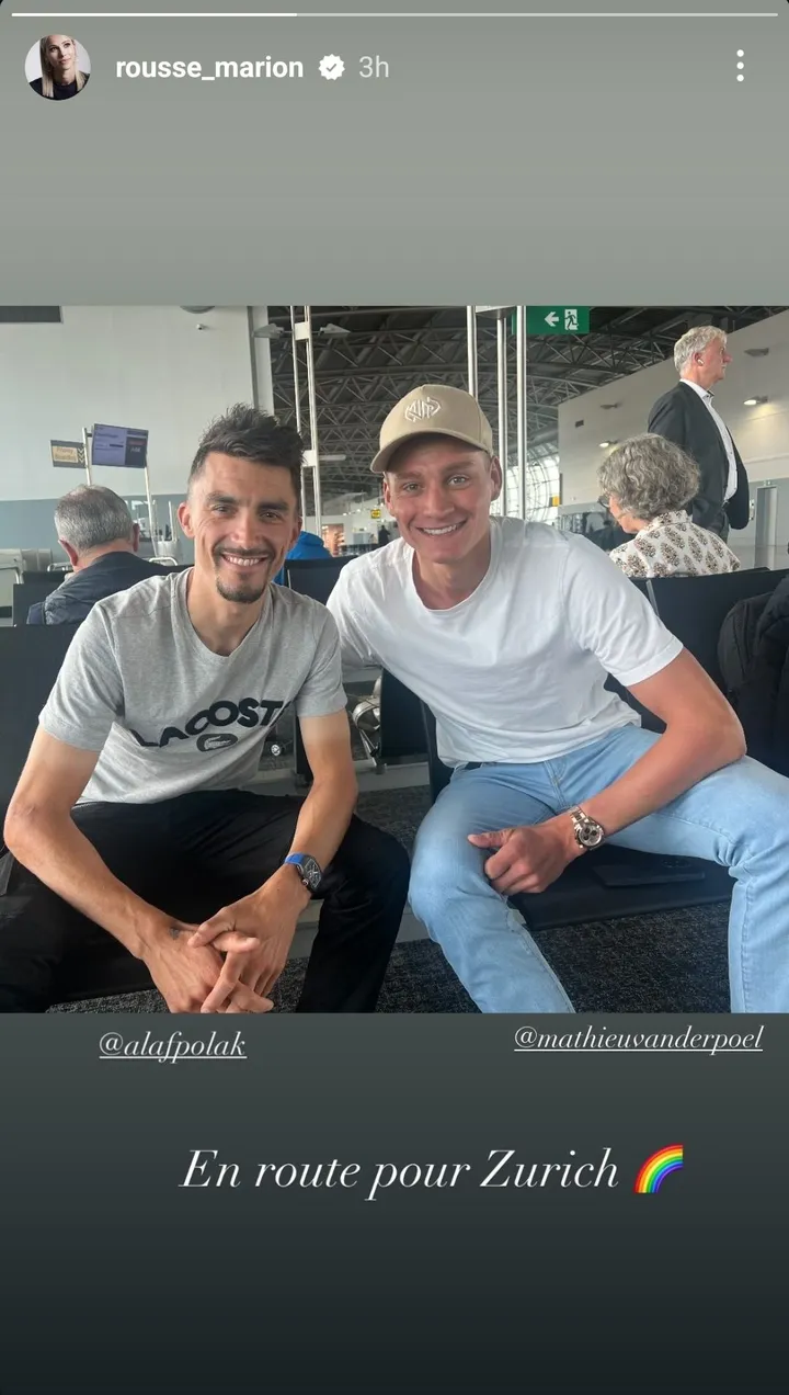 Marion Rousse shares an image of the superstar duo sitting together in the airport, beaming smiles on both their faces.