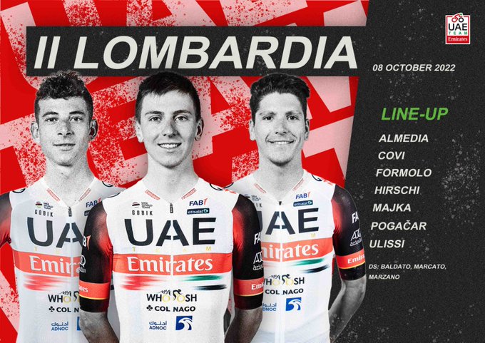 UAE Team Emirates for Il Lombardia: Tadej Pogacar, João Almeida, Alessandro Covi, Davide Formolo, Marc Hirschi, Rafal Majka and Diego Ulissi.