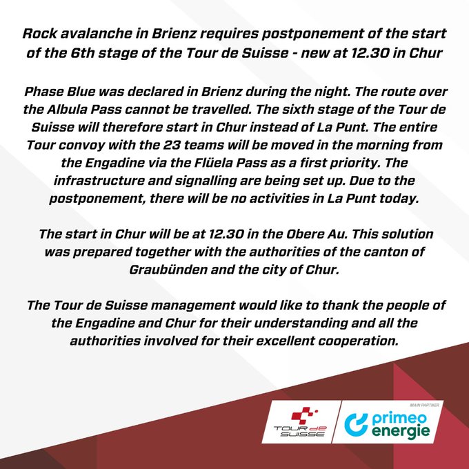 "The route over the Albula Pass cannot be travelled," the organization shared on social media. "The sixth stage of the Tour de Suisse will therefore start in Chur instead of La Punt. The entire Tour convoy with the 23 teams will be moved in the morning from Engadine via de Flüela Pass as a first priority. The infrastructure and signalling are being set up. Due to the postponement, there will be no activities in La Punt today."