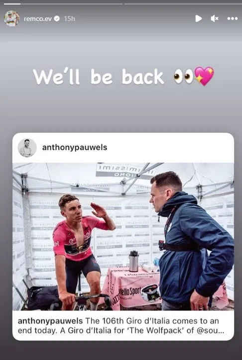 Also, Evenepoel has added the post to his Instagram story, adding the caption "We'll be back." It has recently been confirmed by Patrick Lefevere will not ride the Tour de France or return to defend his Vuelta a Espana title, so the 2024 Giro d'Italia could be the next time we see Evenepoel at a Grand Tour.