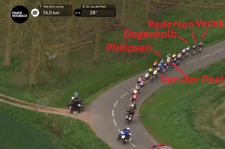 With a tailwind - which led to the speed record in Roubaix to be beaten once again - and strong riders up the road, the peloton could never let the gap grow too much. Pressure was constant. Lidl-Trek and Alpecin-Deceuninck kept the pace high behind, as Dries de Bondt and Dusan Rajovic later jumped across the gap - at a big cost. The scene was set.
