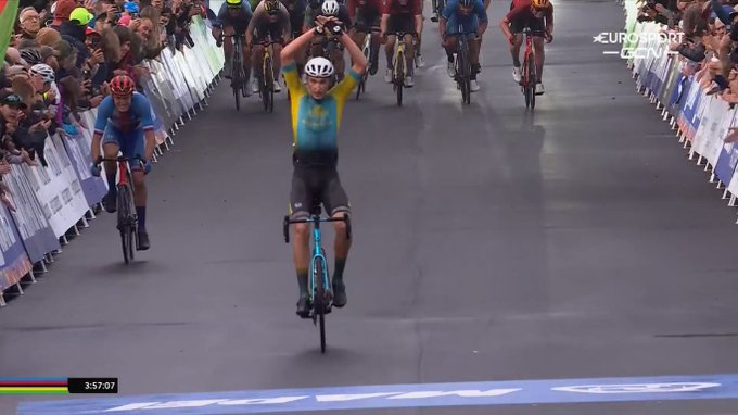 Yevgeniy Fedorov (Kazakhstan), 22 ans, est sacré champion du monde chez les Espoirs ! Il a aligné le Tchèque Mathias Vacek au sprint, qui n'a pas eu la force pour rivaliser. Le Norvégien Søren Wærenskjold complète le podium. Paul Penhoët est 8e. #Wollongong2022
