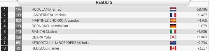 Spain's Alejandro Martinez Chorro had finished 8th in qualification however he put in the ride of his life when it really mattered, incredibly picking up a bronze medal. It even looked for a while like it could have been even better for the Spaniard as rider after rider failed to match his time until Melvin Landerneau eclipsed him by .3 of a second, sending the French crowd into raptures. Ultimately Hoogland was just on another level to everyone else however claiming a comfortable victory.