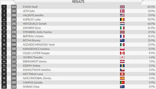 Evans raced into a tally of 60 points which was enough to secure her the gold medal. The podium riders were very close to each other, with Lotte Kopecky missing out by just a point. It were Julie Leth and Jennifer Valente who took the remaining medals respectively